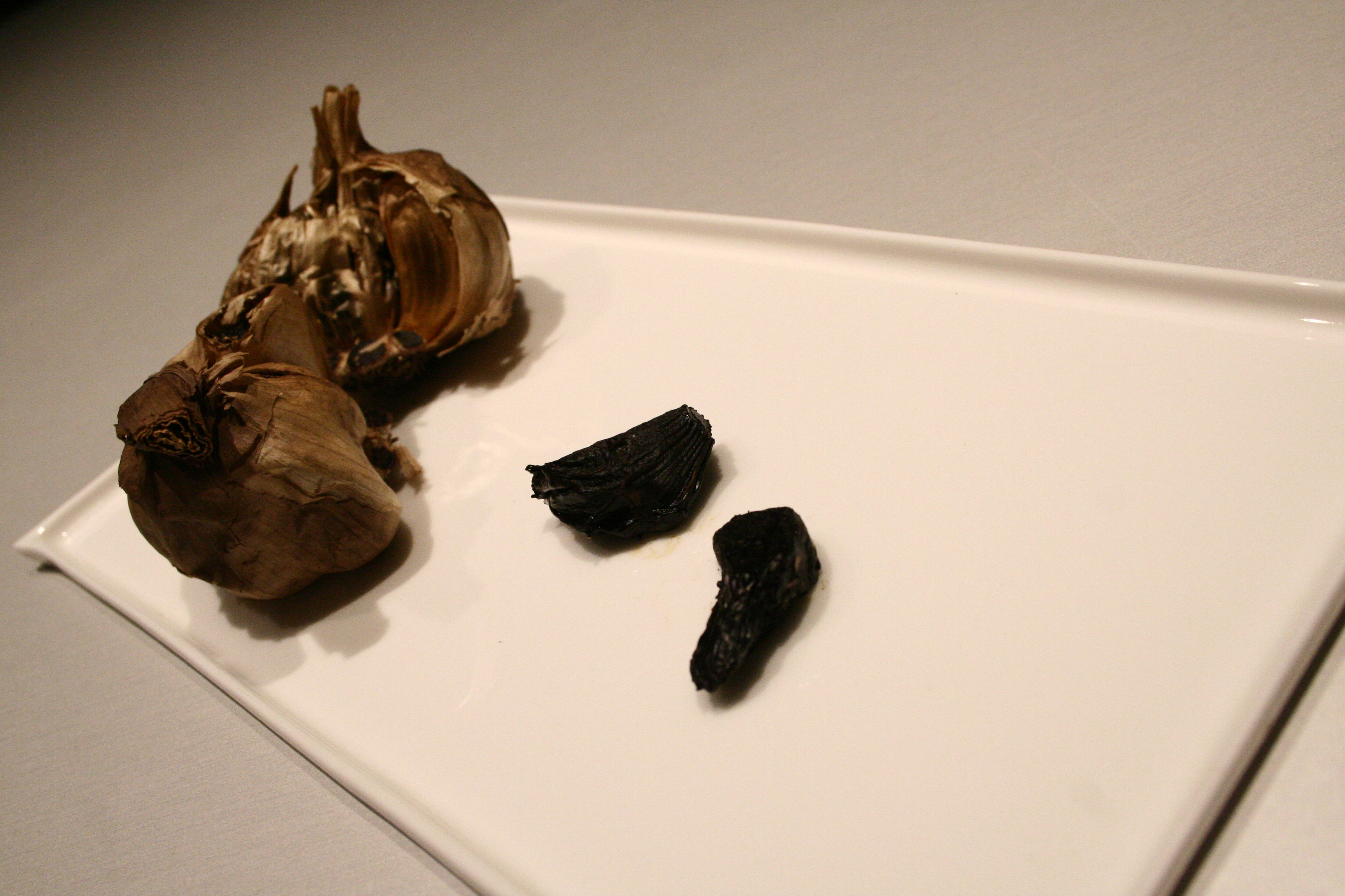 C’est de l’ail fermenté, comme confit, qui a perdu son caractère agressif, tout en conservant son goût, mais tout doux, c’est comme un bonbon. pas d’odeur forte, pas de mauvaise haleine, une texture proche de celle du pruneau. A goûter d’urgence.
