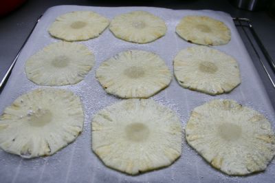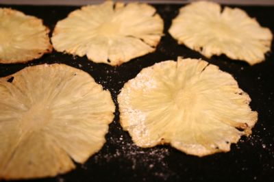 Pelez l’ananas à vif, et couper 6 belles tranches très fines. Saupoudrez ces tranches de sucre glace, posez-les sur une feuille de papier sulfurisé, sur la grille du four, et enfournez pour 1h30 à 100°C, en les retournant délicatement à mi-cuisson. Si elles ont été coupées bien fines, vous aurez des chips croustillantes, sinon plus moelleuses, mais c’est bon aussi ! Réservez.