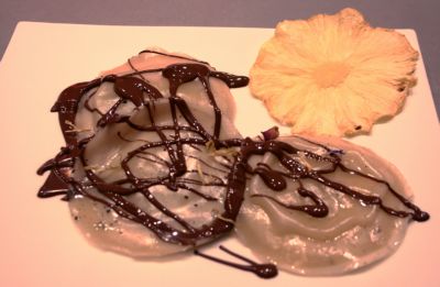 Servez avec le coulis de chocolat et une chip d’ananas.