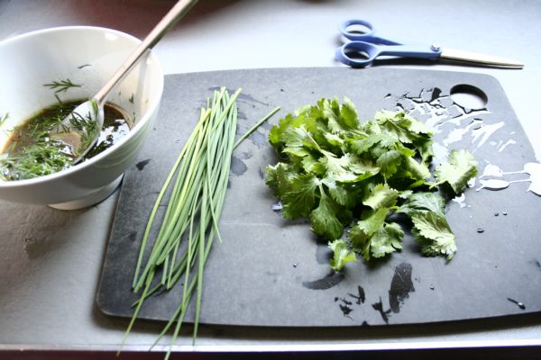 Préparez la vinaigrette pour les asperges avec : 1 c. à soupe d’huile d’olive, 7 cl de jus de langoustine (à la grosse, ça ira), 1 c. à soupe de vinaigre balsamique classique fouettés ensemble, auxquels vous ajouterez toutes les herbes finement émincées. Réservez.