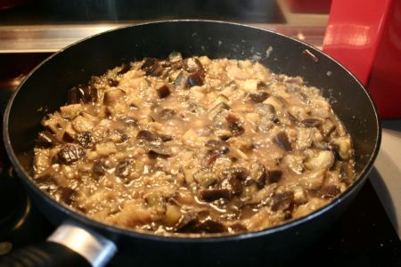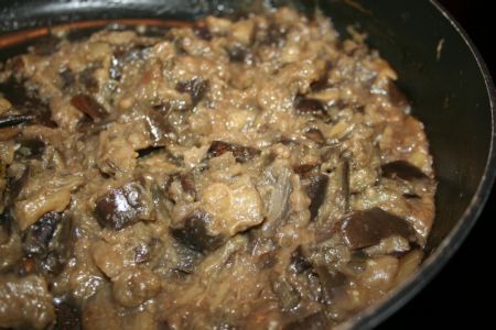 Lavez les aubergines et retirer les extrémités. Si elles sont bien fraîches et fermes, vous pouvez garder la peau. Coupez les en petits cubes, que vous mettrez dans une grande poêle avec l’huile d’olive. Aussitôt, ajoutez le cube de bouillon émietté et un verre d’eau. remuez, laissez cuire doucement, longtemps, jusqu’à obtenir une purée.