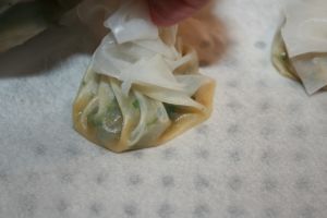 Posez deux galettes de riz l’une sur l’autre sur votre plan de travail, disposez un petit tas du mélange au centre et remonter les bords vers le centre, puis tournez ce que vous avez entre les mains, comme une aumonière, ou un bonbon.
