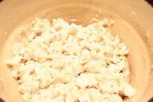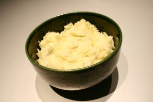 Pendant ce temps, faire cuire les pommes de terre (épluchées) à la vapeur pendant 30 min. Les écraser à la fourchette, et incorporer à cette purée le lait chaud, en remuant.