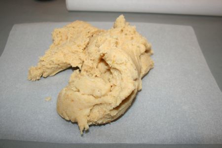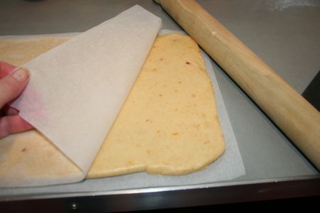 Vous devez obtenir une pâte un peu collante, mais pas trop (il faut qu’elle tienne en boule, qu’elle ne coule pas). Je vous propose de verser la confiture cuillère par cuillère, pour juger au fur et à mesure de la consistance. Découpez 2 morceaux de papier cuisson, à peu près de la taille d’une feuille azyme.