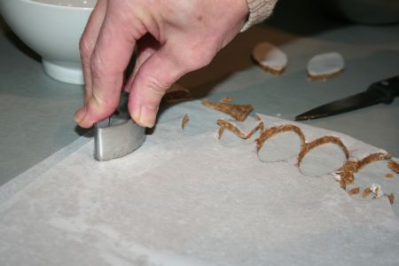 Si vous voulez vous assurez d’une belle découpe, posez l’emporte-pièces sur la feuille azyme, et tracez le contour avec un cutter ou un couteau bien aiguisé, pour pouvoir ensuite enfoncer l’emporte-pièce dans la pâte d’amandes. Le feuille azyme demande à être bien coupée, sinon, elle s’arrache, comme du papier.