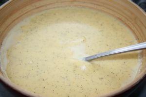 Deuxième chose : il faut impérativement préparer la pâte la veille et la conserver au frais, puis la battre avant de l’utiliser.
