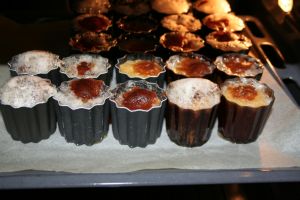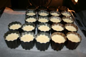 Remplir les moules au 3/4 (ça bout joyeusement pendant la cuisson et ça déborde, il ne sert donc à rien de trop les remplir, sinon c’est le four qui se gave).