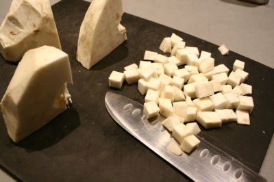 Eplucher le céleri et le couper en dés de 1 cm de coté.