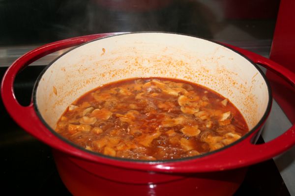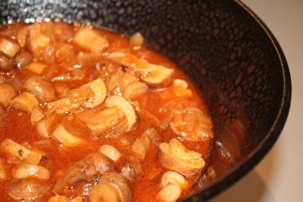 Préparez la sauce en mélangeant tous les ingrédients dans une casserole assez grande, sauf les champignons et les oignons. Portez le mélange à ébullition, laissez bouillir doucement 5 minutes et ajoutez les champis et les oignons.