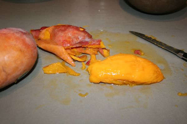 Epluchez les mangues et mixez les (pas trop longtemps, quelques secondes, pour ne pas en faire du jus).