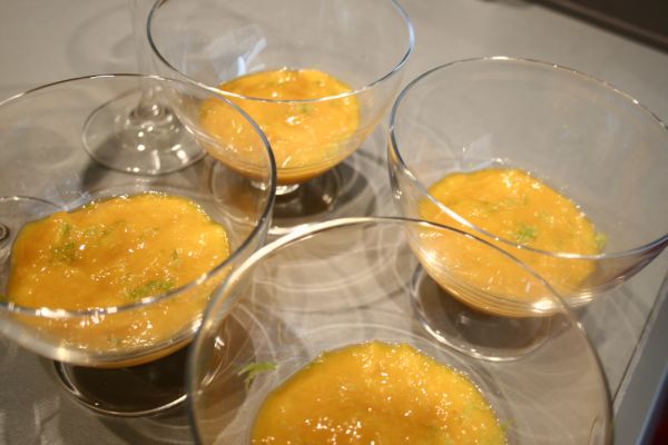 Dans les coupelles, disposez 2 à 3 cuillères de purée de mangue, parsemez de zestes du citron, et recouvrez avec le mélange au crabe.