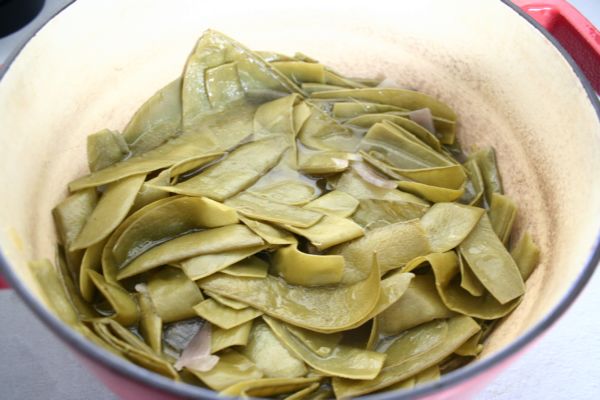 Faîtes revenir les cosses avec l’oignon, mélangez, arrosez d’un peu de vin blanc, puis mouillez au bouillon, à hauteur des cosses (pas trop, sinon ce sera trop liquide). Ajoutez une pomme de terre épluchée, pour donner un peu d’épaisseur, sinon ce sera très liquide. Laissez cuire au moins 1/2 heure, et jusqu’à 1h si vous voulez.