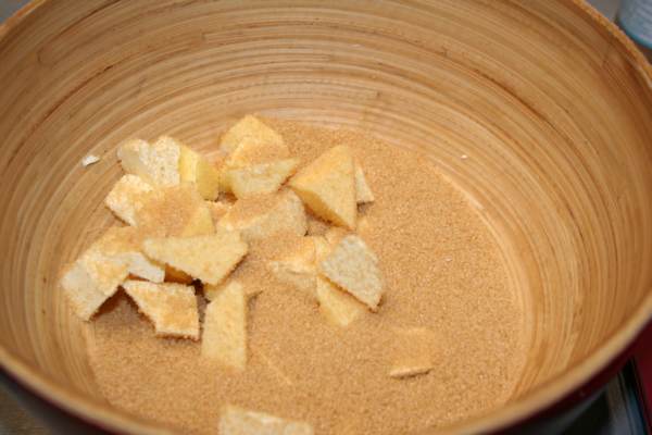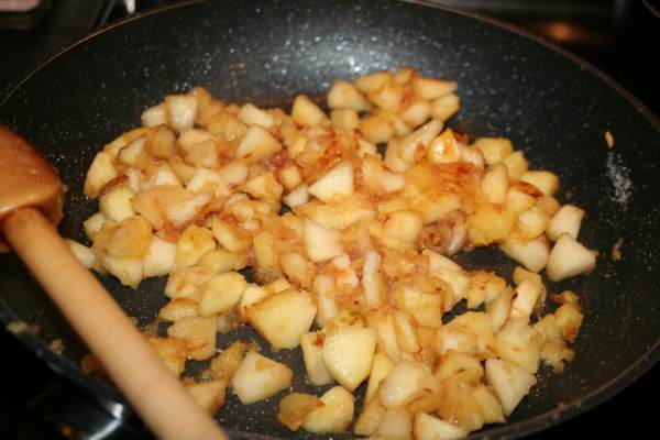 Epluchez les pommes et coupez-les en petits morceaux. Poêlez-les dans le beurre, et quand elles sont un peu dorées, saupoudrez de sucre et faîtes caraméliser. Réservez, laissez refroidir.