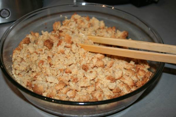 Commencez par préparer le crumble en mélangeant du bout des doigts le beurre et le sucre. Ajoutez la farine et la poudre d’amandes, mélangez avec les doigts, jusqu’à obtenir une pâte qui peut se mettre en boule (surtout si elle est en colère) mais vous l’émiettez un peu avant de la mettre au frais, pour 1/4 d’heure. Après ce quart d’heure, vous l’émiettez dans un plat beurré et l’enfournez à four préchauffé à 200°C pour 25 min.