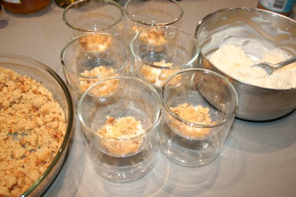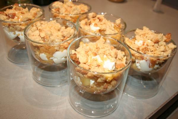 Dans de jolis verrines, alternez les couches : crumble, crème, fruits cuits, crème,…. terminez par du crumble. Et vive la gourmandise !