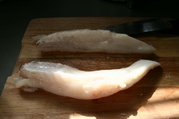 Commencez par éplucher la lotte : il faut d’abord lui retirer la peau, en tirant dessus, tout simplement. Ensuite, plus difficile, retirer les petites peaux transparentes qui se collent fermement à la chair… Pas simple, mais il faut en enlever le maximum, parce que ces peaux, en cuisant, deviennent noires et se rétractent, entraînant avec elle la chair de la lotte. Au lieu d’avoir de beaux médaillons de poisson, vous aurez alors des morceaux tout recroquevillés sur eux-mêmes, et c’est moins joli, et même moins bon (cette peau est dure, un peu caoutchouteuse, une fois cuite). Découpez les deux filets de la lotte en faisant glisser votre couteau le long de l’os central. Pour cette recette, je préfère enlever les ailerons, et les conserver pour une soupe de poisson. Conservez aussi l’arête dorsale pour le même usage (au congélateur).