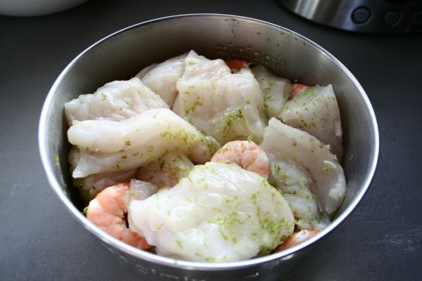 Coupez les filets en gros morceaux. Epluchez lescrevettes et mettez les à mariner avec la lotte et le citron : saupoudrez les morceaux de chair et les crevettes épluchées de zeste de citron vert râpés. Réservez au frais, pendant 2 à 3 heures.