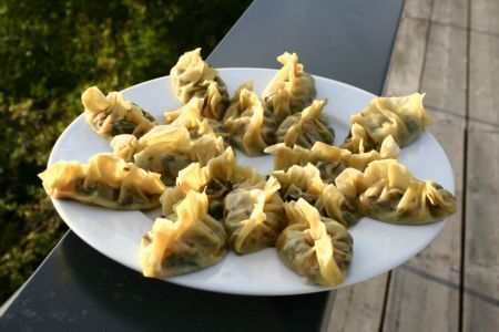 Vous trouverez la forme « aumonière » avec des feuilles de riz, dans la recette « bouchées de crevette à la vapeur« .