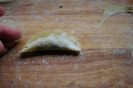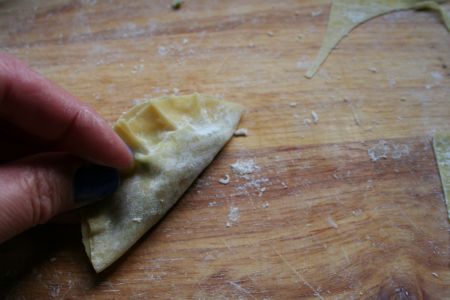 Celles qu’on choisit d’appeler « raviolis » (façon gyozas japonais), avec des ronds de pâte à la fécule, de cette façon :
