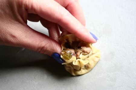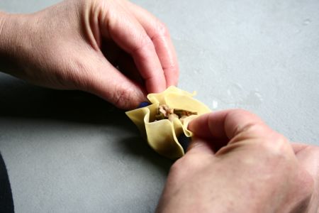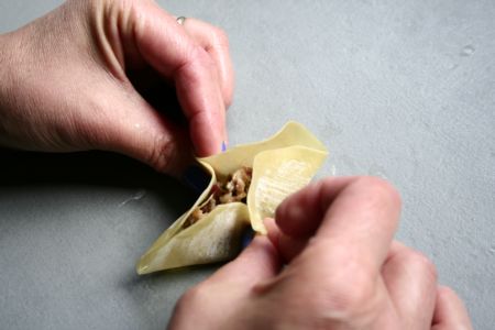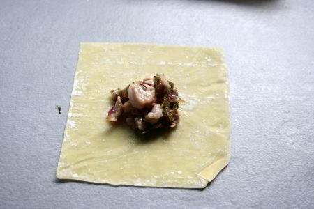 Celles qu’on va appeler « bouchées » sont confectionnées avec des feuilles à ravioles, ou à wonton, de cette façon :