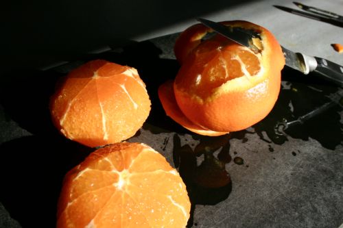 Pelez à vif les clémentines, conservez 1 zeste et détachez les quartiers en passant un couteau entre la chair et la peau, comme ça :
