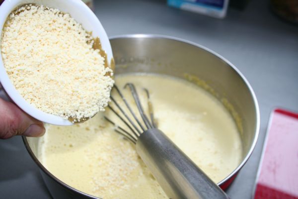 Faîtes chauffer le lait. Pendant ce temps, mélangez le sucre aux jaunes d’oeufs, jusqu’à obtenir une consistance mousseuse. Ajoutez la pâte de pistache (celle-ci est assez liquide, du coup, c’est facile), mélangez, puis ajoutez progressivement le lait bouillant, en remuant. Pour finir, incorporez le lait en poudre. Remettez tout ça dans la casserole, et faîtes chauffer doucement jusqu’à ce que la crème nappe la cuillère (83°C).