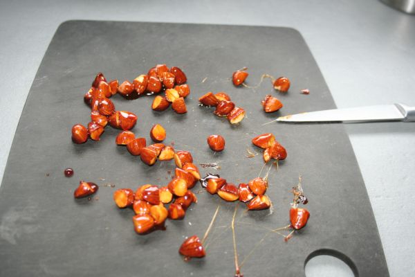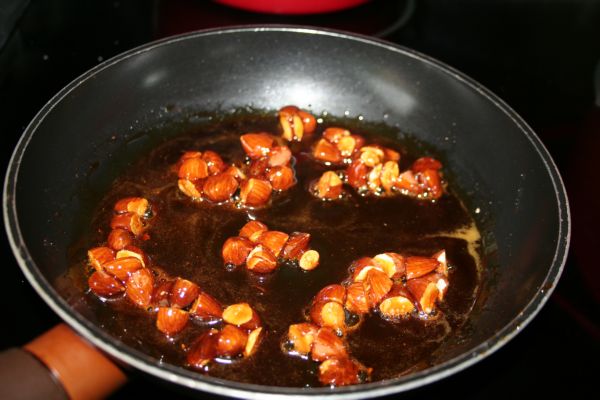 Pendant ce temps, concassez grossièrement les amandes. Saupoudrez une poêle de sucre, laissez caraméliser, puis incorporez les morceaux d’amandes. Attention à ne pas vous brûler… Lorsque les amandes sont bien enrobées de caramel, posez les sur une planche à découper, qui ne craint pas la chaleur, et laissez-les refroidir. Séparez les si elles sont collées.