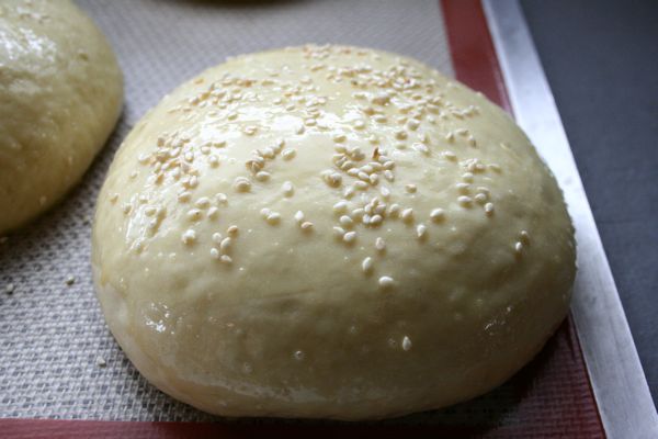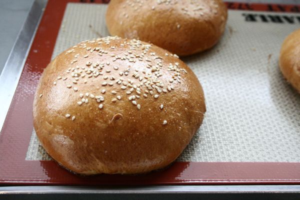 Badigeonnez les pains de jaune d’oeuf et parsemez des graines de sésames torréfiées. Enfournez à four chaud (180°C) pour environ 25 min (surveillez, ça va dépendre de votre four). Réservez les pains.