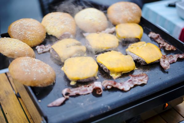 On passe bientôt à table, assurez vous de la cuisson des frites (n’en prévoyez pas trop, le burger slowfood, ça cale bien). Approchez vous de votre plancha bien chaude, déposez-y les pains (préalablement coupés en 2 , horizontalement, vous vous en doutez) pour les réchauffer, puis au centre, les steaks. Retournez les steaks, posez dessus les tranches de cheddar pour qu’elles fondent pendant que les steaks finissent de cuire. Dans ce même temps, grillez aussi les tranches de bacon, et demandez à un de vos gourmands baveux de tartiner les pains avec la sauce, vous ne pouvez pas tout faire avec seulement 2 mains, pas vrai ?