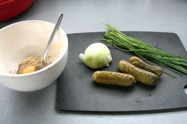 Posez une râpe sur un bol, râpez les cornichons et 1 oignon blanc. Dans le bol, ajoutez aussi la ciboulette ciselée, une c. à c. de sucre (ben oui…), les oignons fris réduits en poudre, puis la mayonnaise, et mélangez moi tout ça, votre sauce est prête.