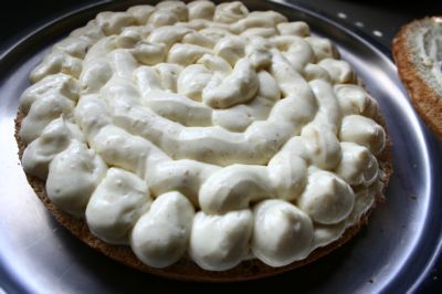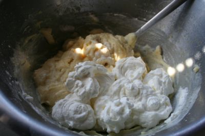 Pour oublier notre frustration, occupons nous à préparer la crème : faîtes bouillir le lait avec la vanille. Fouettez les oeufs avec le sucre, jusqu’à ce que le mélange blanchisse. Ajoutez-y le mélange farine / maïzena, mélangez, puis ajoutez le lait bouillant progressivement, en fouettant bien énergiquement. Les petits malins auront reconnu le principe de la crème pâtissière. Ils ont raison. Alors ils continuent en reversant tout ça dans la casserole du lait, pour ramener la crème à ébullition, tout en remuant toujours énergiquement, jusqu’à épaississement. Comptez 3 minutes après la reprise de l’ébullition. Les plus prudents, ou trouillards (comme moi), ajouteront à ce moment une ou deux feuilles de gélatine ramollie dans l’eau froide et essorée. Votre crème doit être prise, alors versez la dans un récipient froid et couvrez la d’un film alimentaire (collé à la surface), pour éviter la formation d’une « croûte » en surface. Rangez moi ça au frais, vous ne pourrez l’utiliser que lorsqu’elle sera complètement froide. A ce moment seulement, vous y incorporerez la chantilly, bien délicatement.