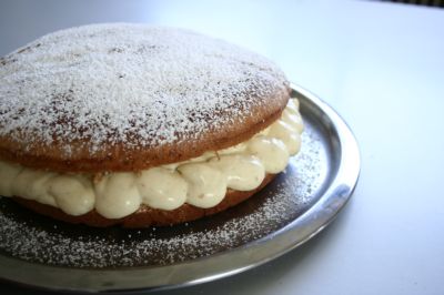 Coupez la brioche froide en deux, dans le sens de l’épaisseur, bien entendu. Avec une poche à douille, pour faire joli, disposez la crème sur la brioche, et refermez vite fait avec l’autre moitié. N’allez pas vous amuser à appuyer dessus.