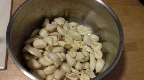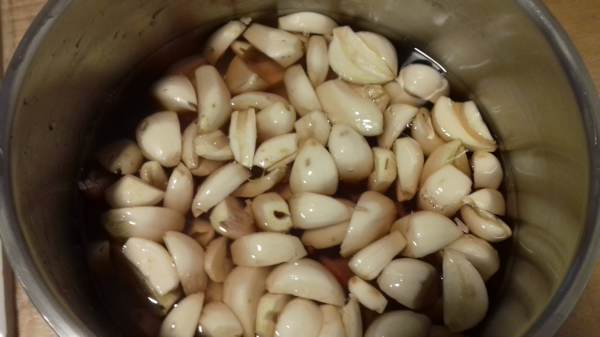 Commencez par éplucher toutes les gousses, et, si elles ont germé, enlever les germes. Plongez les dans le mélange eau / vinaigres , du sel, portez à ébullition, et laissez bouillir 4 à 5 minutes. Egouttez les gousses et étalez-les sur un torchon pour les laisser sécher toute la nuit. Le lendemain, remplissez les bocaux et recouvrez d’huile d’arachide. Vous pouvez dégustez quelques gousses dès à présent, ou même les utiliser en cuisine (en casserole, avec un rôti, par exemple), ou les conserver plusieurs mois avant de les manger.