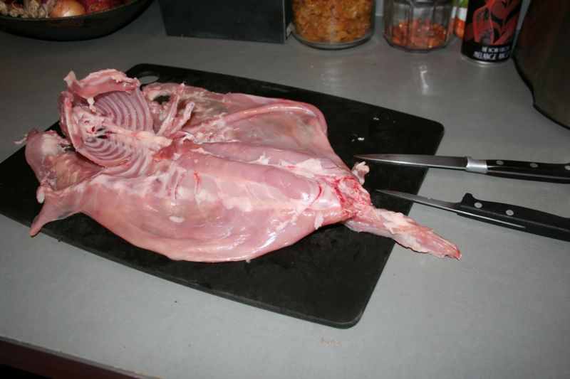 Commencer par désosser la bête, après lui avoir coupé la tête et les pattes ; il y a pas mal de vidéos sur internet pour voir comment faire. En cours, ça donne ça :
