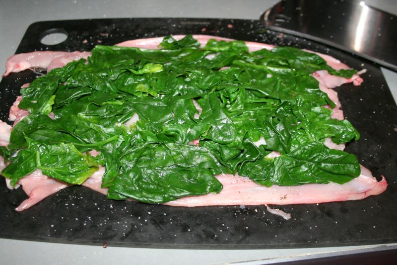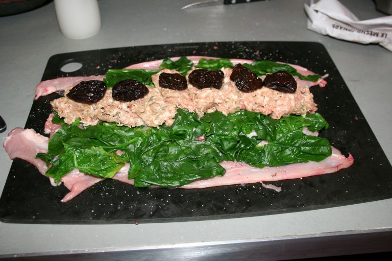 Donc, vous l’aurez compris, il est tout plat, c’est mieux si vous avez réussi à ne pas trop le percer (sinon vous colmatez avec des petits bouts de chair récupérés sur les pattes). Vous l’assaisonnez, puis étalez dessus les feuilles d’épinards (lavées, épluchées et blanchies), puis au milieu, un boudin de chair à saucisse, la petite farce, et les pruneaux.