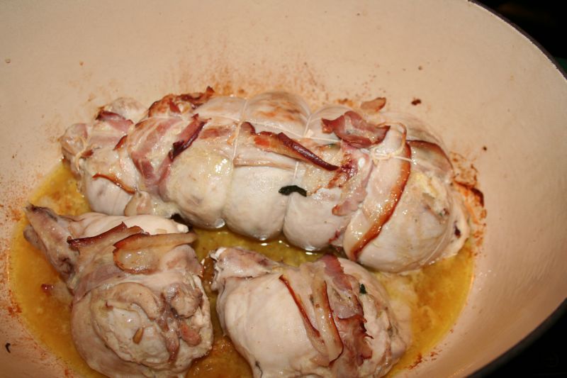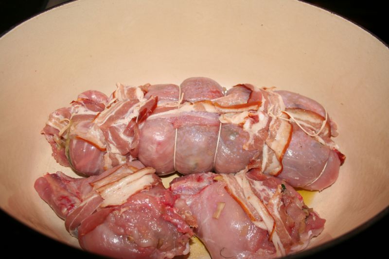 Maintenant, il faut le rouler serré, boudiné, et le ficeler, avec quelques fines tranches de lard fumé. Pour les plus courageux, on désosse aussi les cuisses et on les farcit, pareil. Pour les fermer, je les ai cousues.