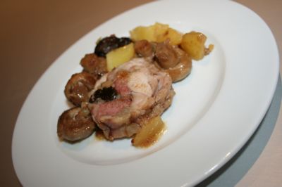 Allez, il est temps de passer à la casserole, dans un peu d’huile, sur toutes les faces. On arrose avec un peu d’eau, de vin blanc, ne pas oublier le sel et un bon poivre (!). Couvrir et laisser cuire à feu moyen environ 50 min. Pour servir, couper les ficelles, et trancher comme un roti. Et juste avant ce stade là, ça donne ça :