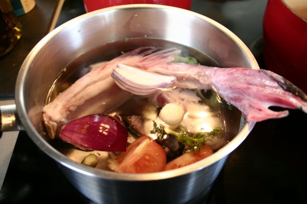 Préparez le fumet avec les parures du poisson, le vin, et la garniture aromatique, à faire cuire doucement pendant 1 heure.