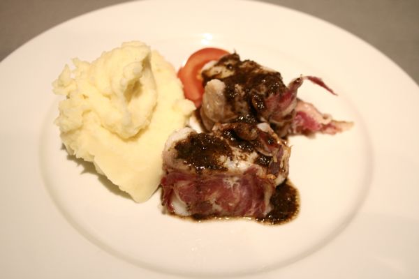 L’accord de la lotte et de la pancetta est intéressant, et très relevé par la tapenade, ce qui en fait un plat de poisson assez puissant en goût, que je sers avec une purée de pommes de terre, histoire d’équilibrer. La difficulté, c’est la pancetta : l’idéal, c’est d’en trouver de la « plate », comme le lard fumé chez nous, pas roulée, quoi. En italie, c’est facile, ici moins. Le problème, vous le constaterez sur mes photos, c’est que les tranches rondes ne tiennent pas bien à la cuisson, alors qu’en tranches plates, on peut correctement enrouler la lotte et ça tient mieux, forcément !