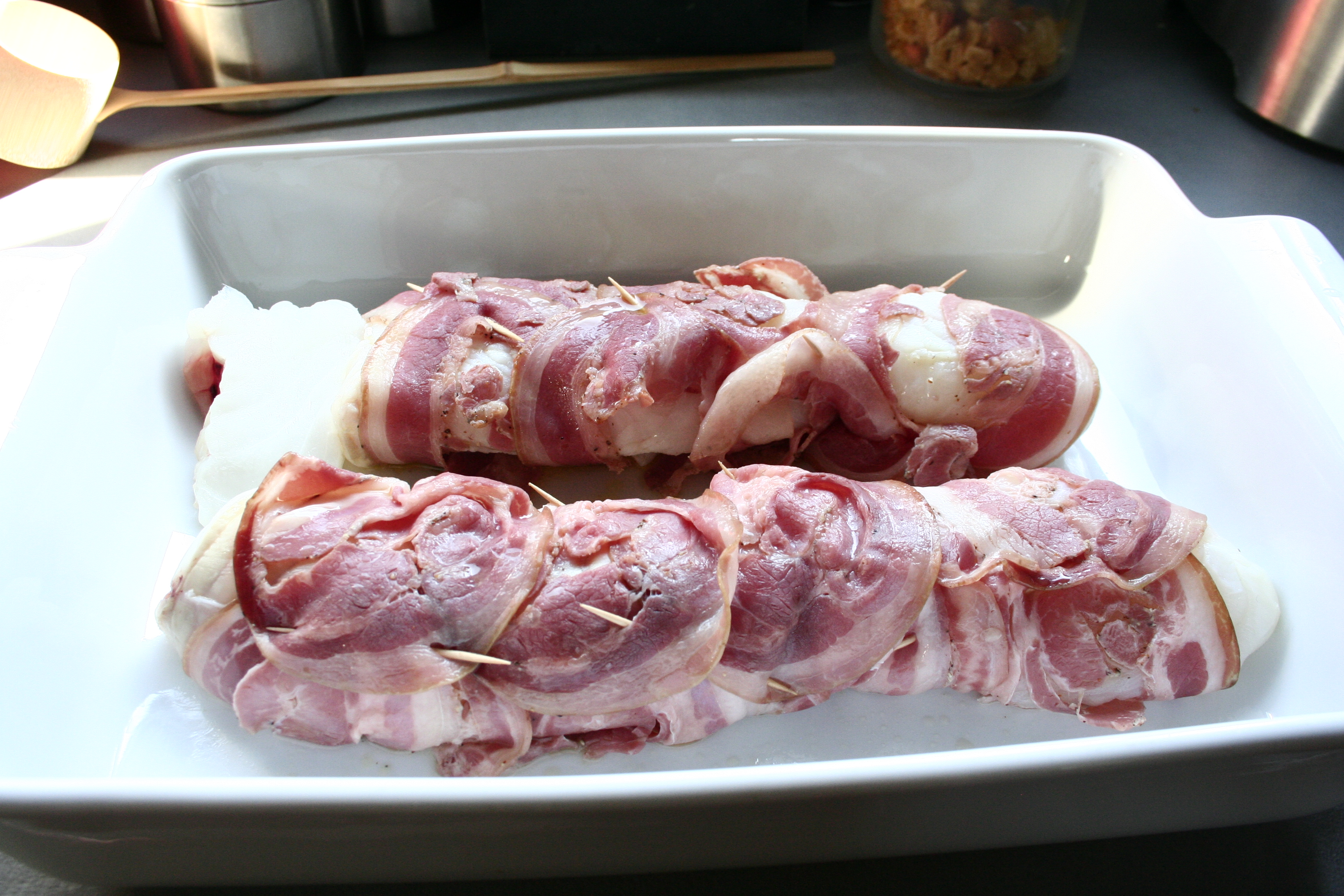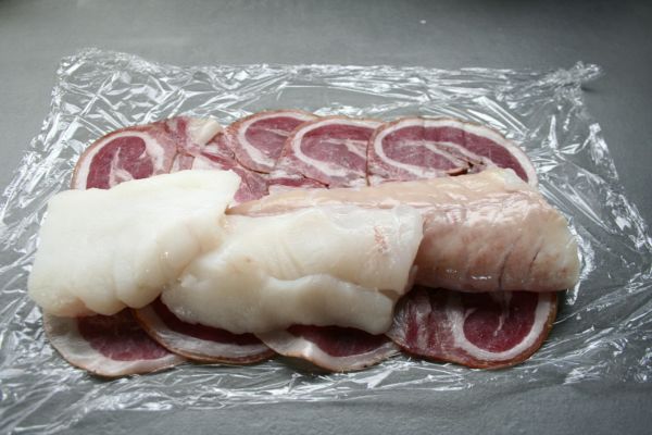 Sur une feuille de cellophane, étalez les tranches de pancetta, sur lesquelles vous disposerez les morceaux de lotte. Servez vous de la feuille de cellophane pour rouler l’ensemble, comme une natte pour faire des makis. Vous pouvez fixer un peu avec des cure-dents, mais ça ne change pas grand chose, en fait, ça maintient juste un peu. Si vous avez de la pancetta plate, vous n’aurez pas de problème. Réservez.