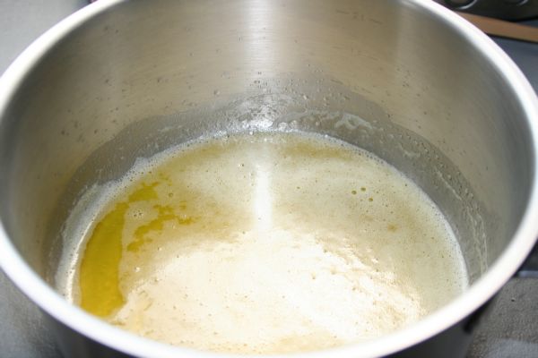 Faîtes fondre le beurre , jusqu’à coloration (s’il y a de la margarine, ça ne colore pas). Mélangez les ingrédients en poudre, ajoutez les blancs d’oeuf, puis finir avec le beurre fondu.