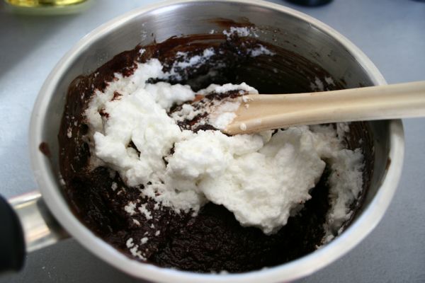 Battre les blancs en neige bien ferme, et les ajouter au mélange. Terminer par une cuillère de rhum brun. Beurrer un moule à cake, dans lequel on versera la pâte.