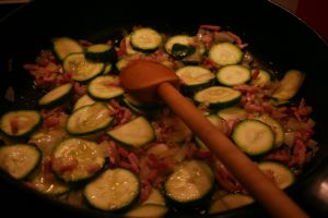 Faire revenir dans de l’huile d’olive l’oignon émincé avec les lardons. Réserver. Dans la même sauteuse, faire revenir un peu les courgettes (elles n’ont pas à dorer, c’est juste pour les faire un peu cuire). Réserver aussi.