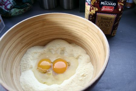 Vous trouverez beaucoup de recettes de pâtes à base de farine de blé tendre (la farine ordinaire que vous trouvez partout), mais je trouve les pâtes bien meilleures avec du blé dur, c’est plus difficile à trouver, alors cherchez dans une épicerie italienne ou sur internet, ça se trouve quand même.