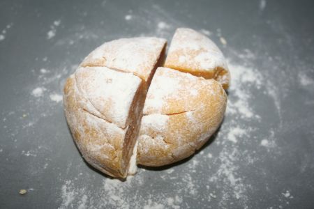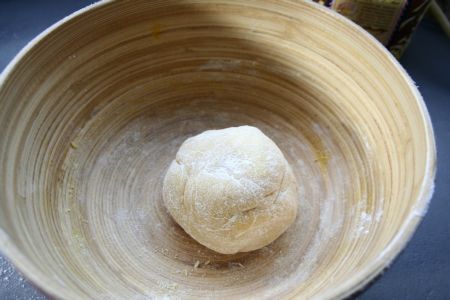 Faire un puits avec la semoule, et ajouter les oeufs, le sel et l’huile. Mélanger à la main (farinées, les mains), jusqu’à obtention d’une boule. Pétrir une dizaine de minutes, voici une technique, si besoin : écraser la boule avec la paume de la main, plier un coté puis l’autre, aplatir, rouler, tourner et recommencer :