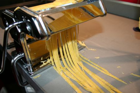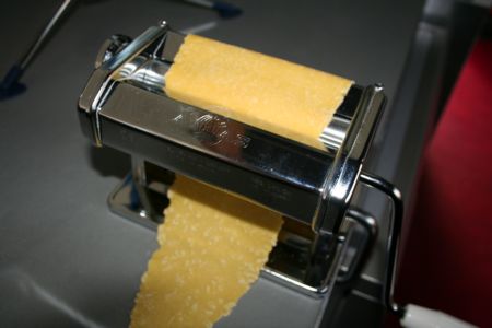 Au bout de 10 min. façonner une belle boule, filmer, réfrigérer 30 min. Sortir du frigo et travailler au laminoir suivant la pâte désirée. Si vous n’avez pas de laminoir, étalez au rouleau à pâtisserie et découpez suivant la forme des pâtes que vous souhaitez obtenir.