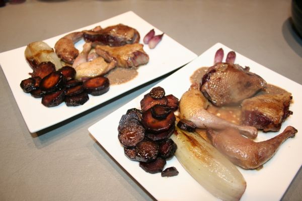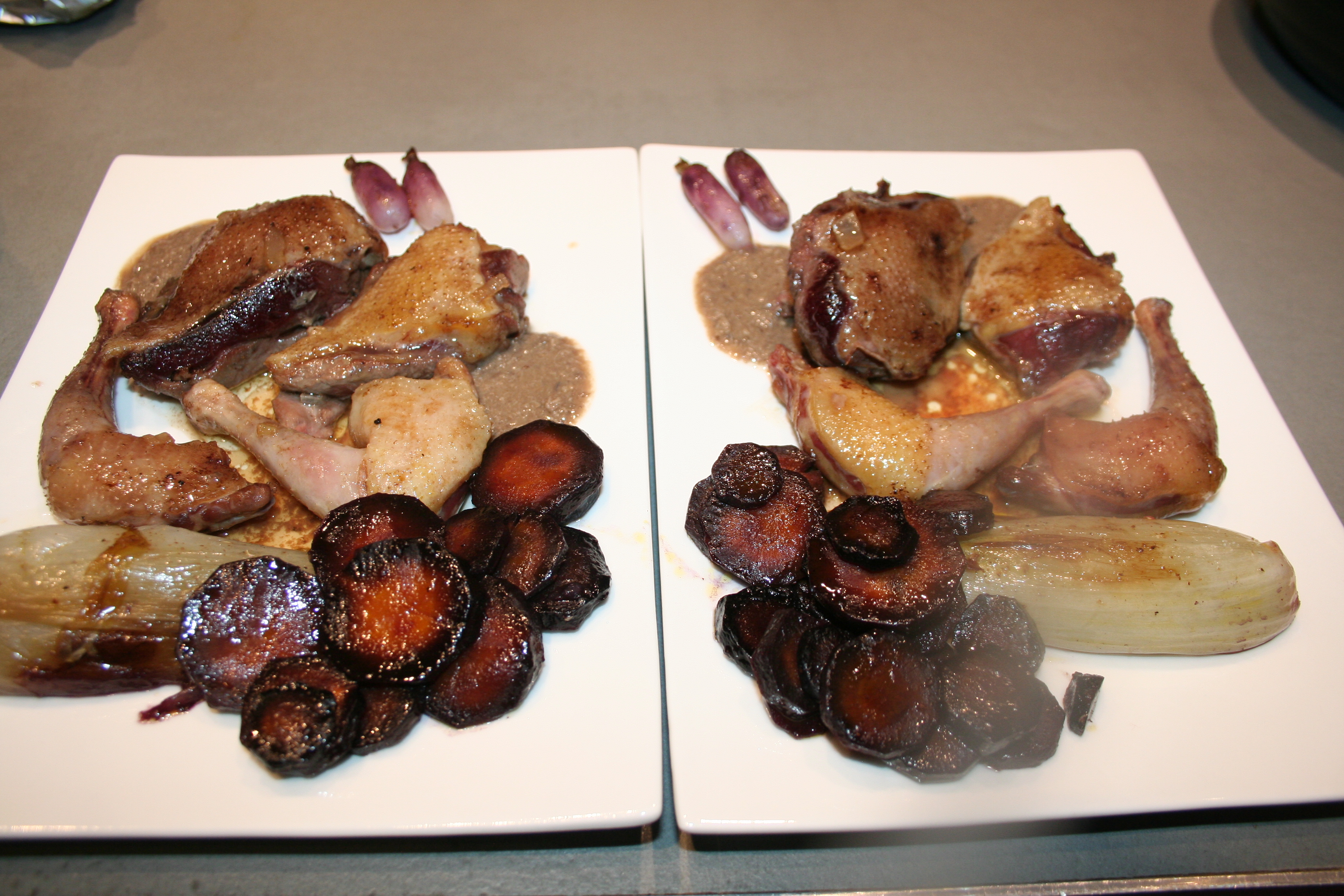 Alors, ça y est, on a bien traîné autour du champagne, certains se sont gavés de petits fours (toujours les mêmes), mais enfin, on passe à table. on mange l’entrée, et là, 5 minutes en cuisine : vous réchauffez les carottes, les assiettes, et vous dressez. Récupérez l’Armagnac qui est au fond du plat, pour le mélanger avec un peu du bouillon réduit des carcasses, et arrosez la viande avec cette sauce légère. Poivrez (le Sichuan s’accorde très bien avec le pigeon) Attention, régal assuré ! Belle maman épatée, beau-papa aux anges…