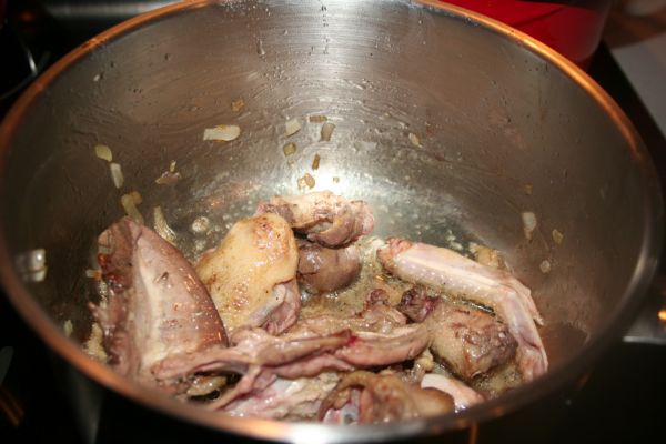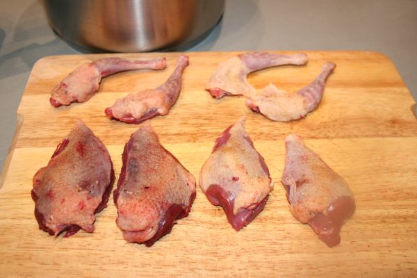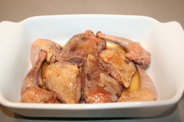 Dans une casserole, faîtes revenir l’oignon, puis les filets, mais très peu, juste 1 min de chaque coté, à peine. Procédez de la même façon avec les cuisses, mais là, vous pouvez les laisser 3/4 min. de chaque côté. Salez, faîtes chauffer le cognac et flambez les morceaux, avant de les enfourner pour 3 heures, à 70°C, recouverts d’une feuille de papier alu. .