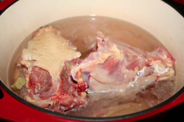 Préparez un bouillon en couvrant la carcasse d’eau salée, avec un bouquet garni, dans une casserole, faîtes cuire doucement pendant une petite heure.