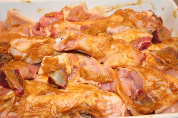 Préparez une marinade en mélangeant le jus de citron, l’huile d’olive, la sauce soja, le curcuma, le cumin, du sel, puis finir par 3 c. à s. de beurre de cacahouètes. Mélangez bien, et badigeonnez les morceaux de poulet. Couvrez d’un film et laissez marinez plusieurs heures au frais.